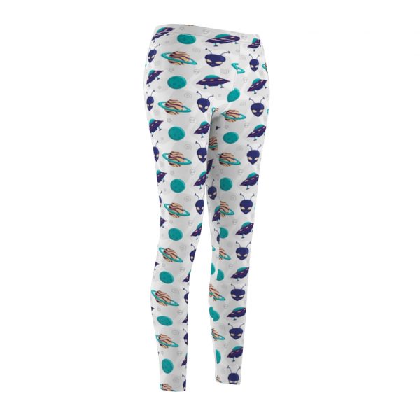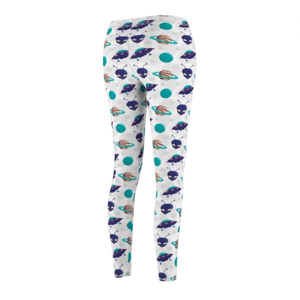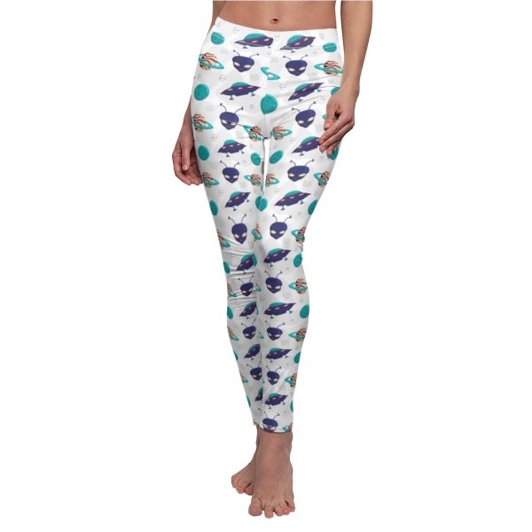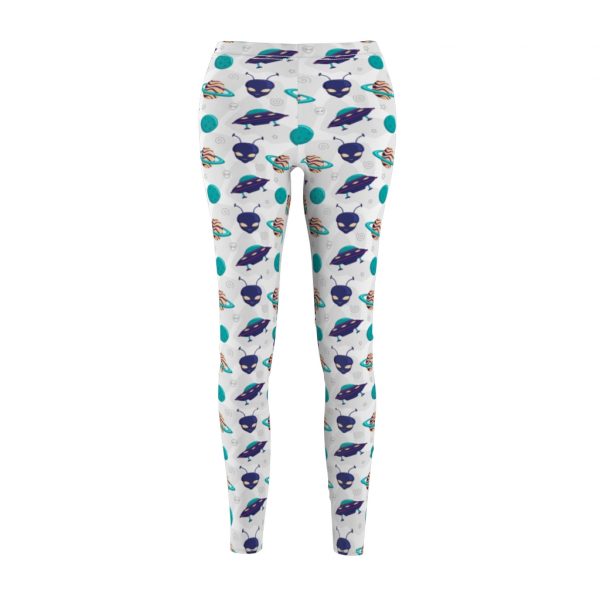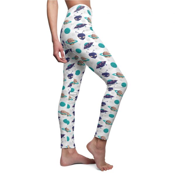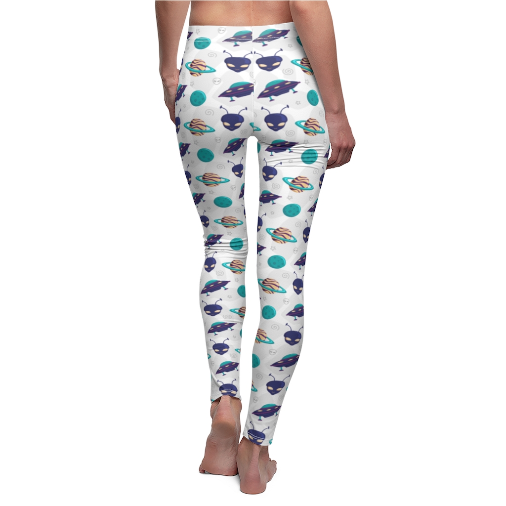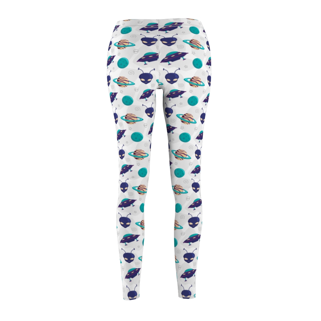 Alien and UFO leggings. This pair of leggings has a cute alien and ufo print for the space enthusiast. Made for every day casual wear or athletic use.
