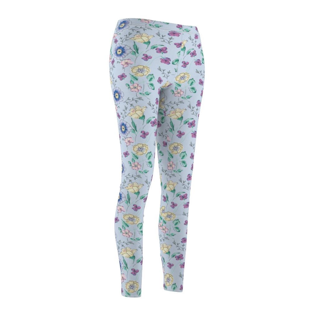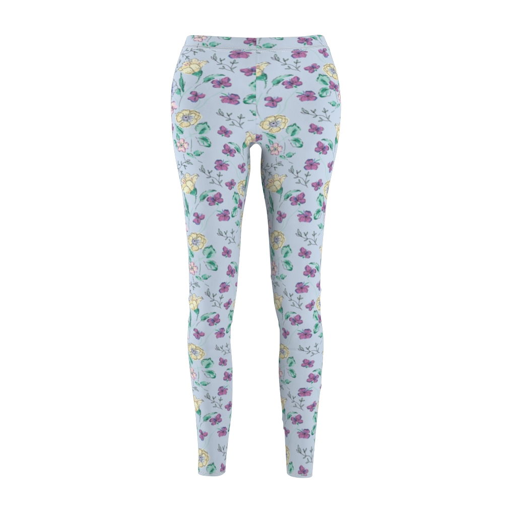 Blue flower leggings. Hand drawn floral print on light blue leggings.