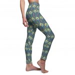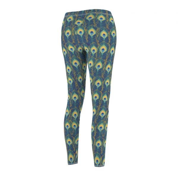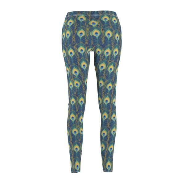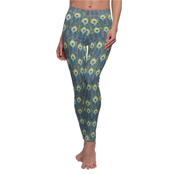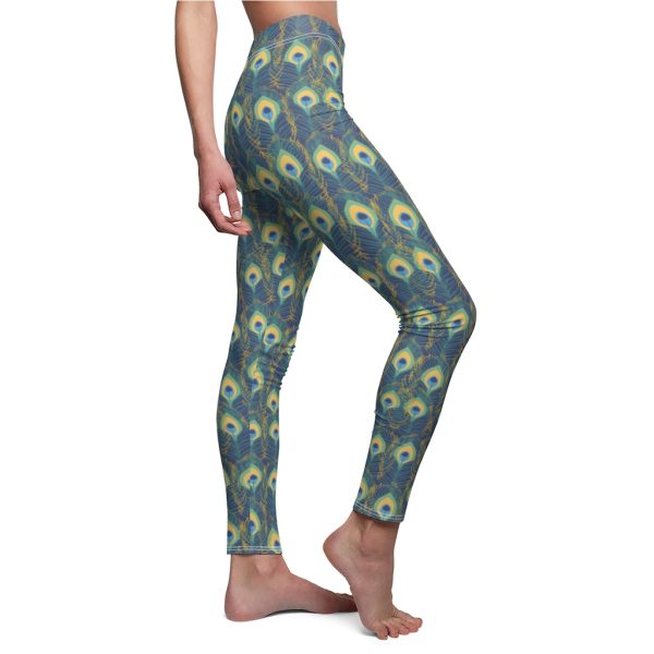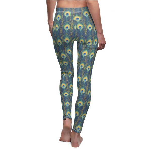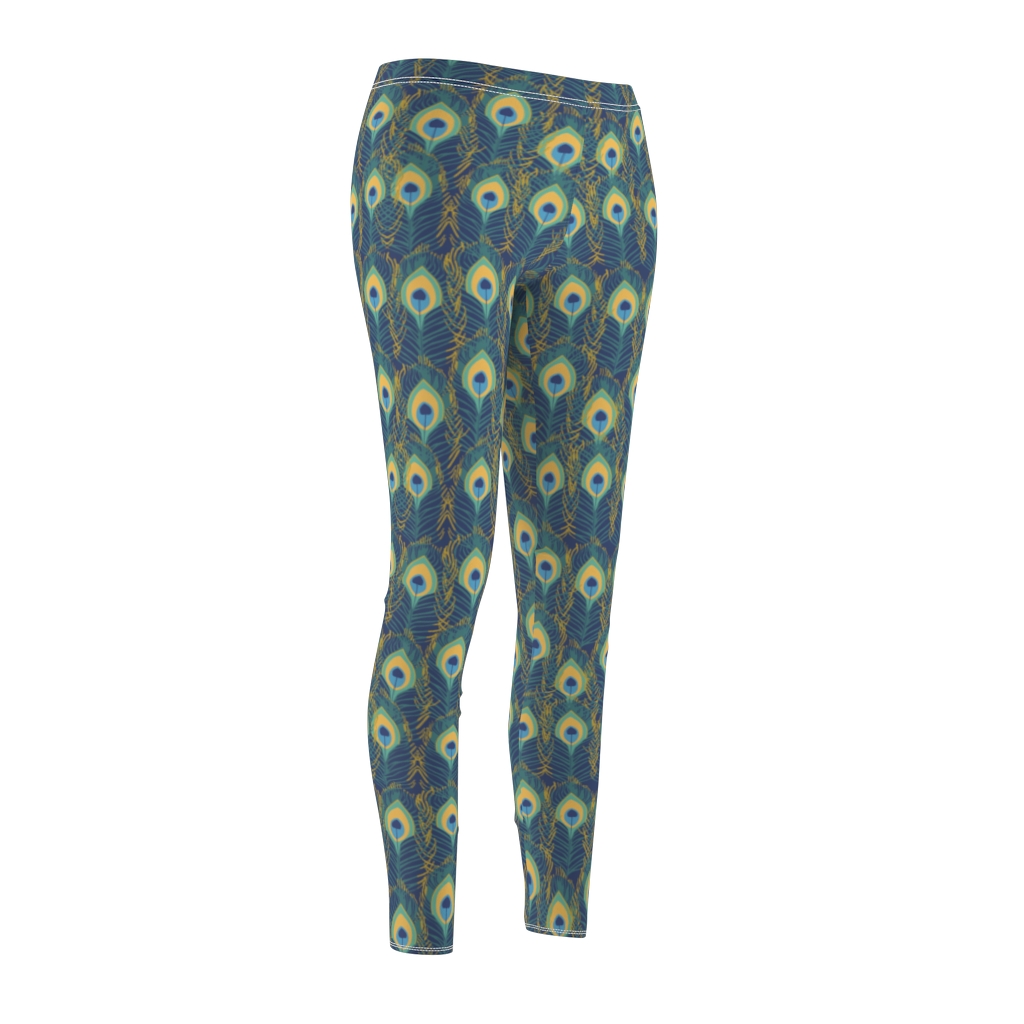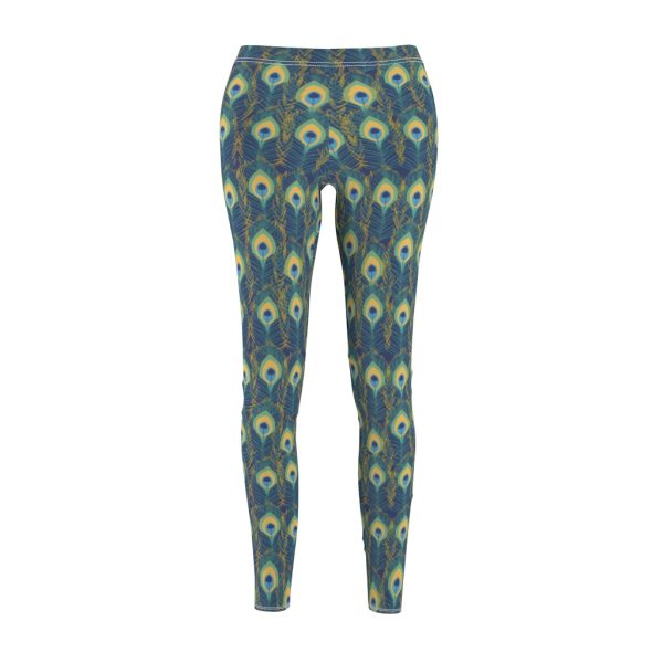 Blue Peacock print leggings. Animal Peacock feathers printed on blue leggings.