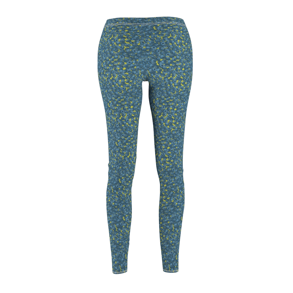 Blueberry leggings. Fruit leggings featuring all over print blueberry pattern on pale yellow leggings.