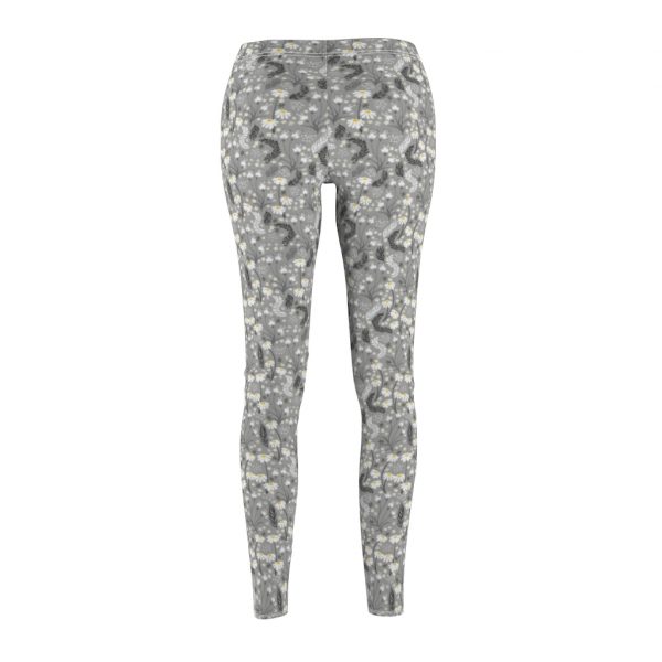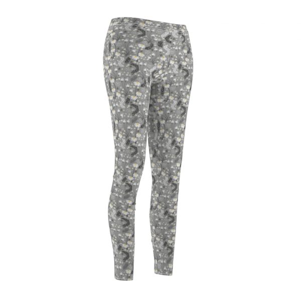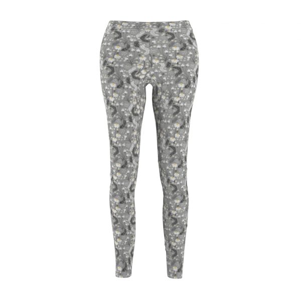Chamomile print leggings. Gray leggings with white chamomile flowers and light gray leaves.