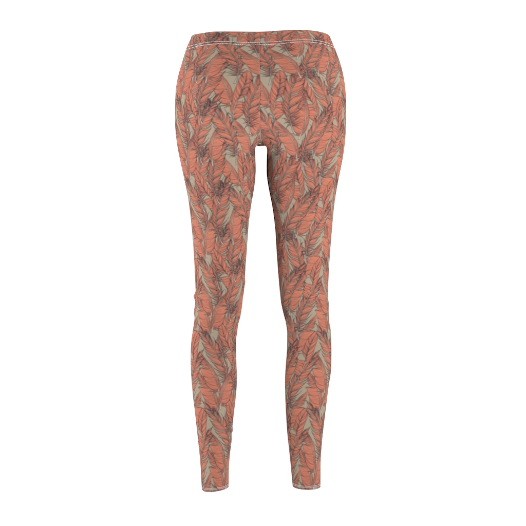 Feather leggings. Coral colored feather print on light gray leggings.