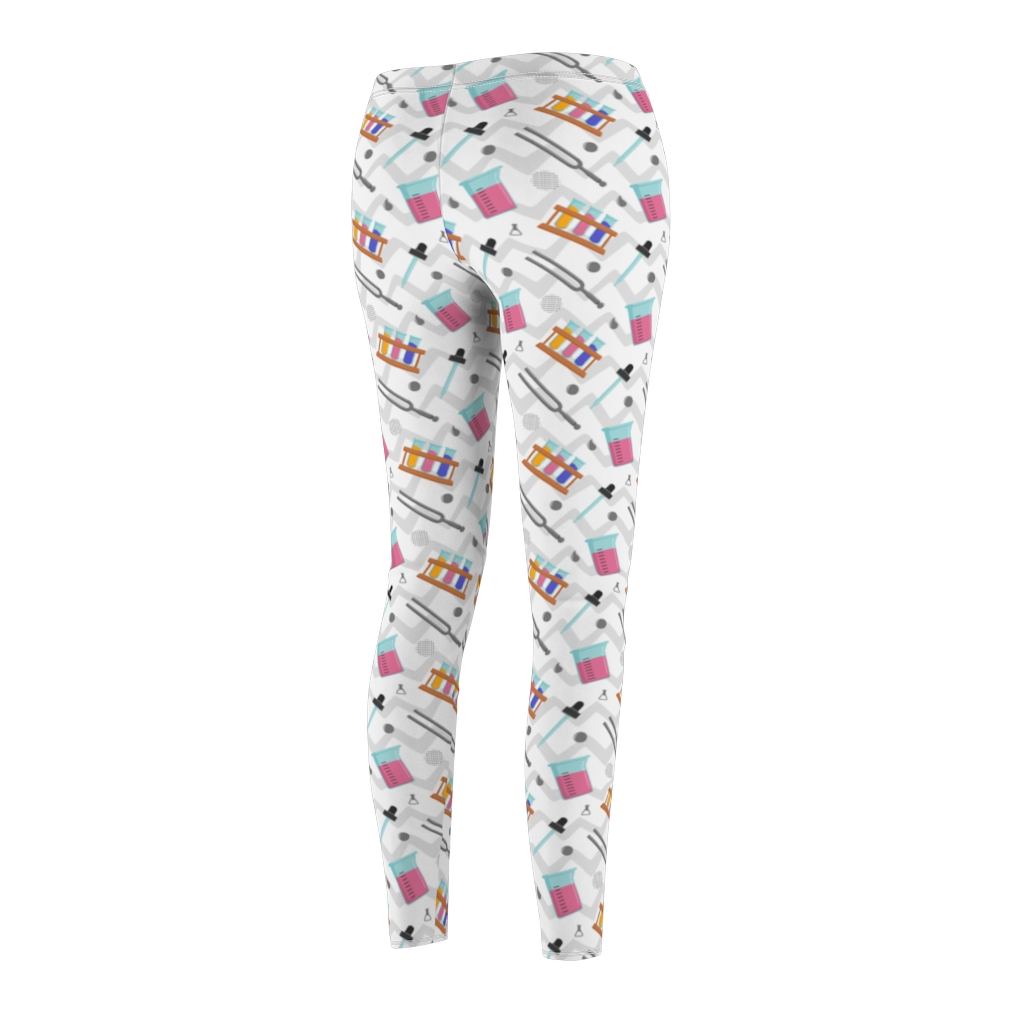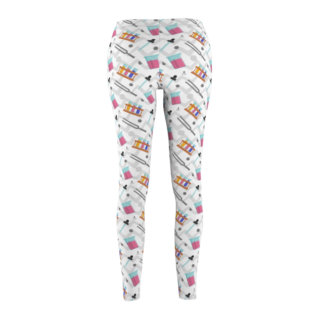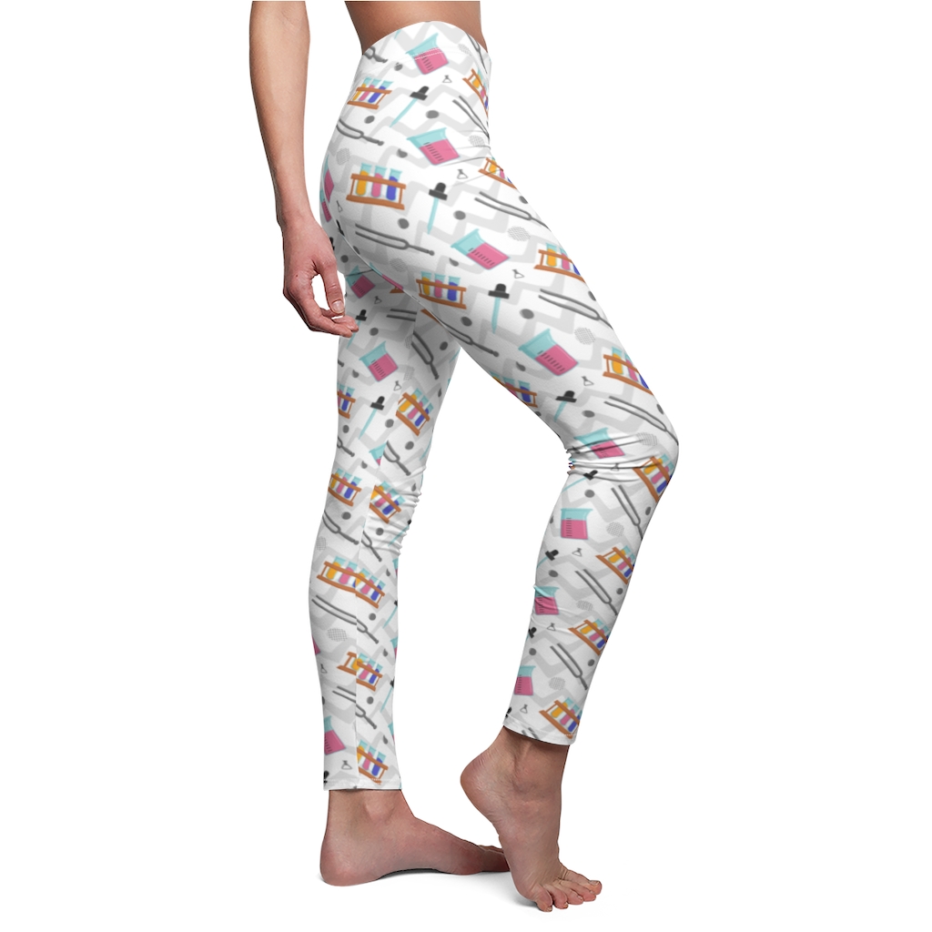 Leggings for pharmacists. This pair of leggings is patterned with chemistry related items. They would make a great pair of leggings for pharmacists or lab technicians.