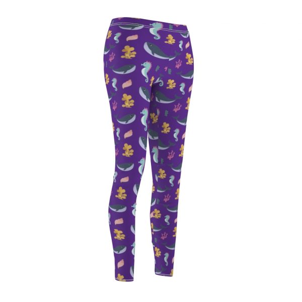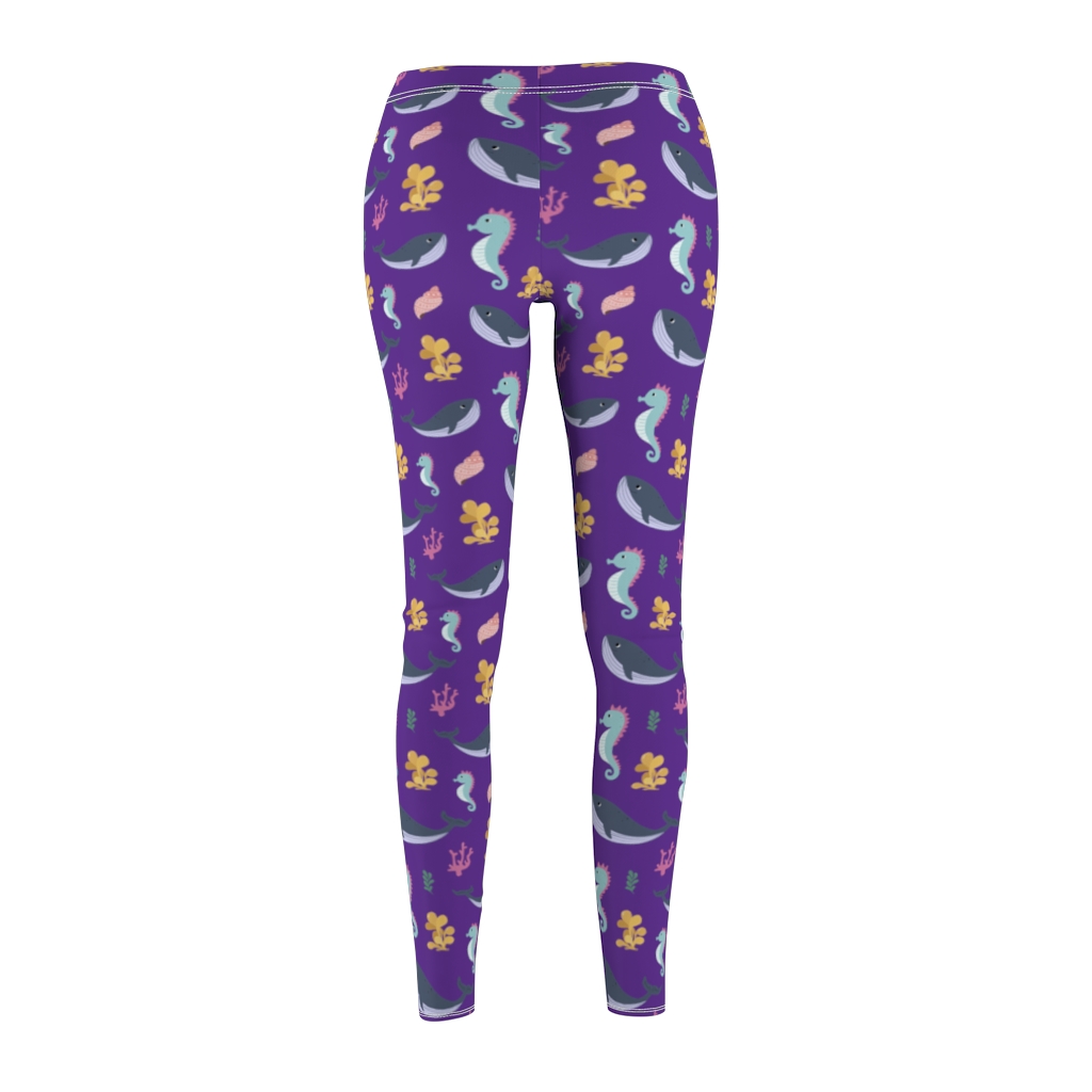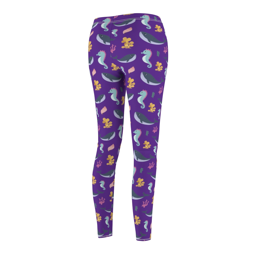 Purple seahorse leggings. These make a perfect gift for anyone interested in marine biology. Whales, seahorses and coral on purple leggings.