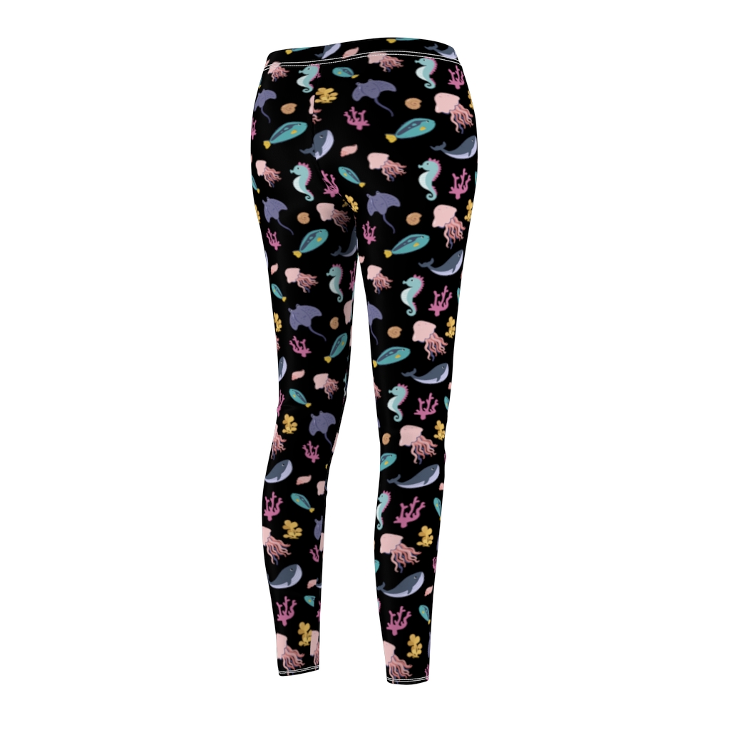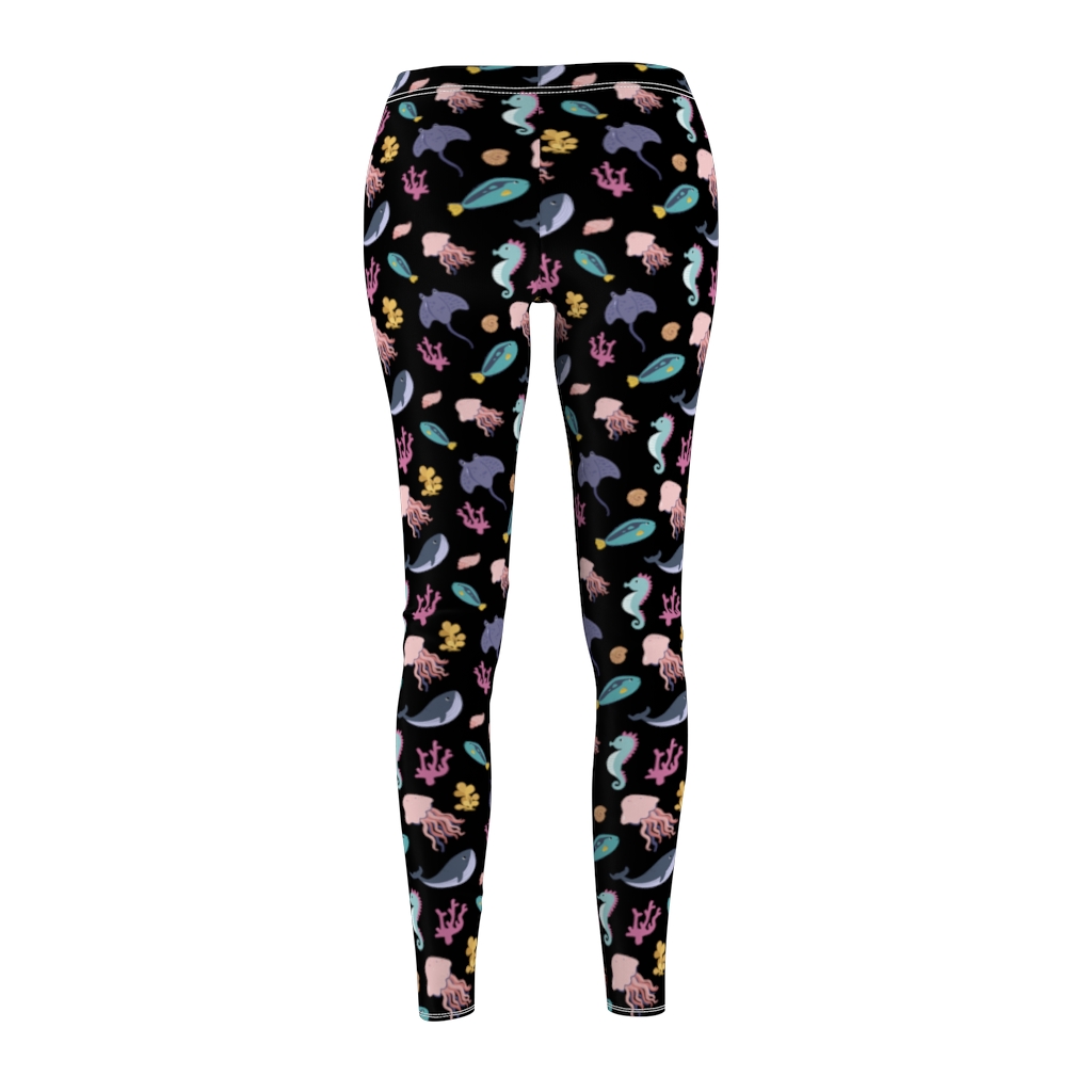 Sealife leggings. Are you into marine biology? This pair of leggings features a variety of sealife including jellyfish, whales, fish, coral, stingrays and sea horses on black leggings.